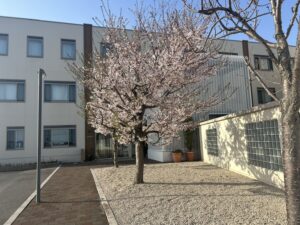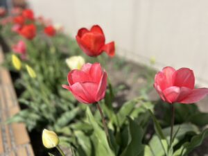 さらに、花壇では色とりどりのチューリップも顔を出し、赤・黄色・ピンクの鮮やかな花が並んで咲き誇っています。